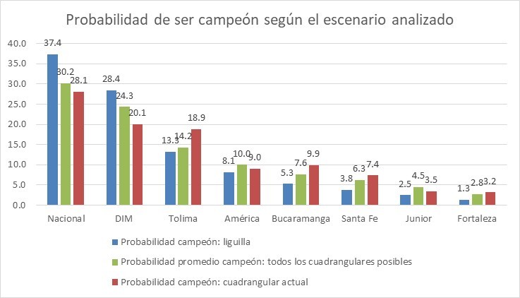 • Escenario 1 (barra azul en el gráfico): liga de 8. Muestra la probabilidad de que cada equipo sea campeón si los 8 clasificados jugaran una liga de todos contra todos. • Escenario 2 (barra verde): promedio de cuadrangulares. Muestra la probabilidad promedio de ser campeón para todas las combinaciones posibles de grupos que pudieron surgir del sorteo. • Escenario 3 (barra roja): sorteo real. Muestra la probabilidad de ser campeón según los grupos tal como quedaron definidos tras el sorteo.